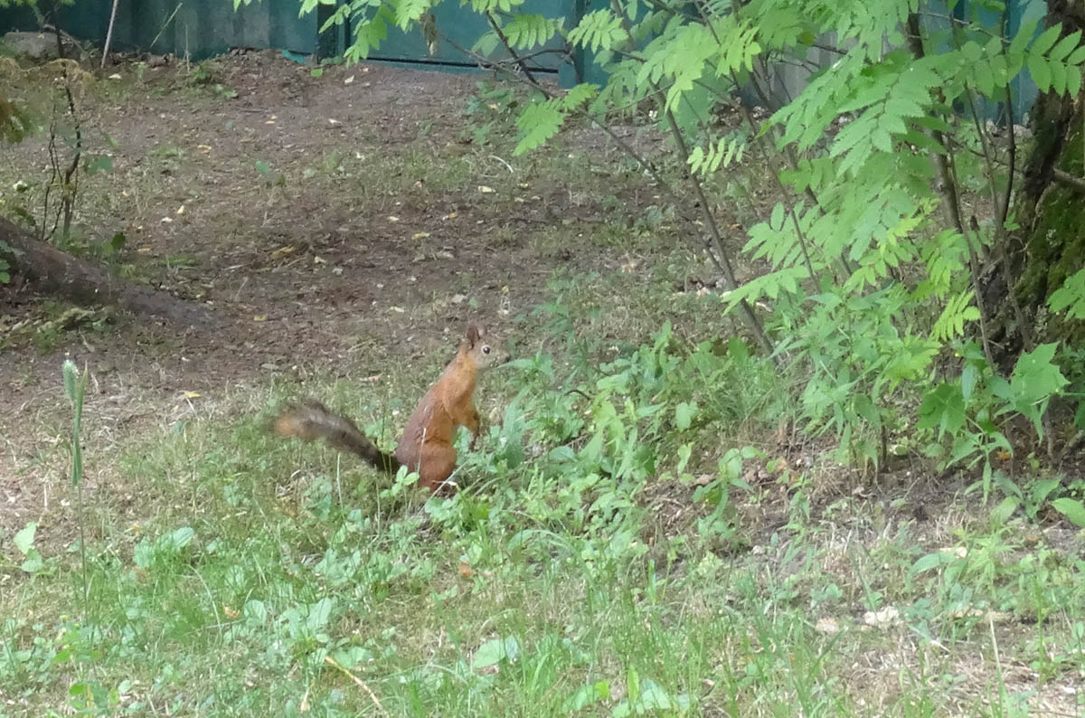 Бельчонок уже спускается близко ко мне. Но пока еще боится. Присматривается)).