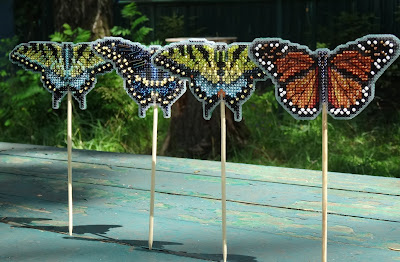 Бабочек вышила столько, что самой смешно)). Переклинило меня)). Вышивала их пока у меня пластиковый лист не закончился)). Потом аккуратно вырезала, сзади у них зеленый клеевой фетр, укрепила на палочки. Теперь их можно в горшки цветочные вставлять.