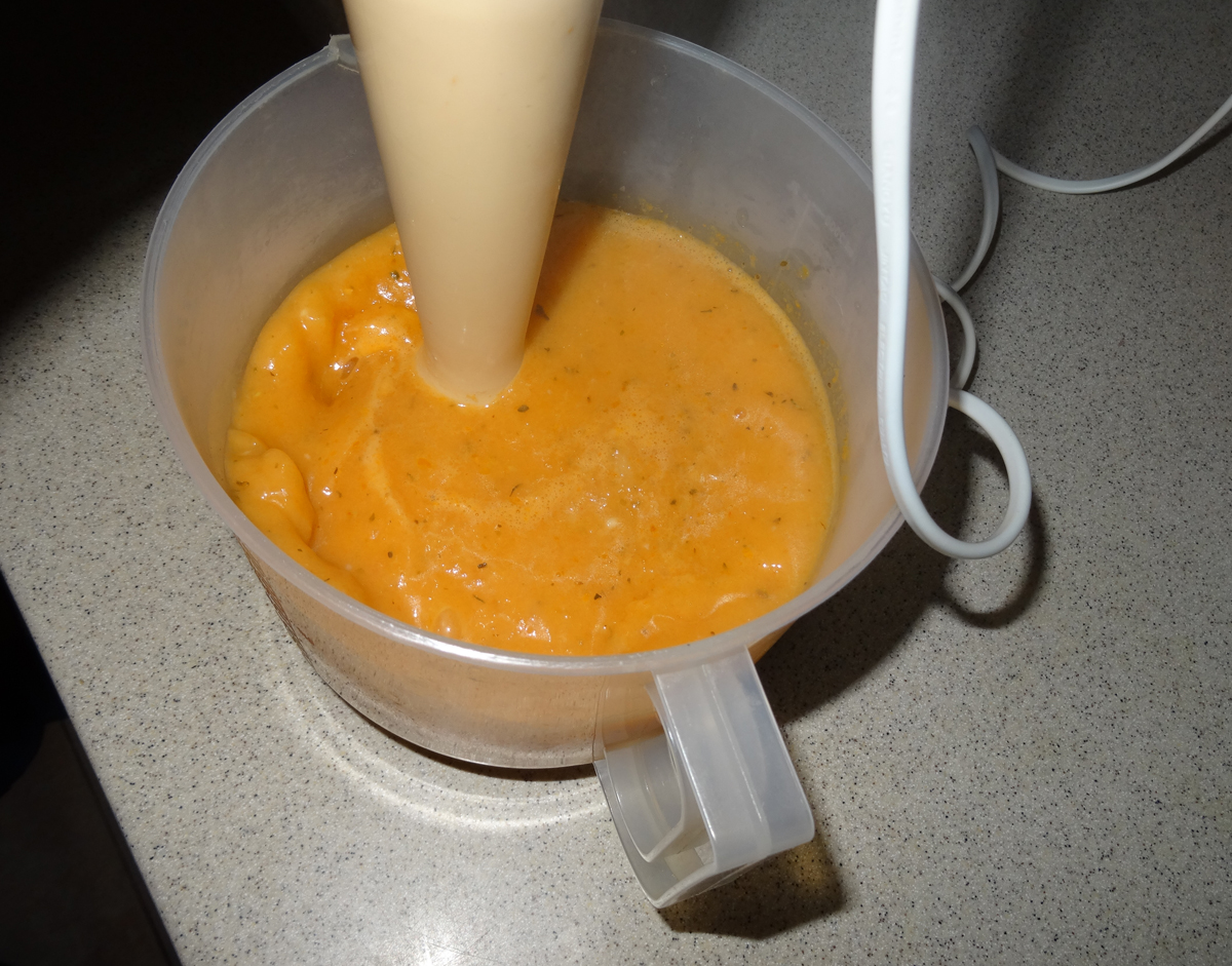 Я готовлю замороженные порционные "комплекты" для изготовления таких супов. На это я трачу какой-то кусок своего времени в момент, когда я чищу, режу и сортирую по контейнерам овощи, но зато потом я достаю заготовку и просто бросаю ее в воду. Экономится масса времени. В этих контейнерах у меня смесь - тыква, перец, кабачки (которых сейчас полно в магазинах и стоят они не так дорого). Кстати, прошлой зимой я делала пюре из тыквы (отваривали и потом смалывала блендером), раскладывала по коробочкам и замораживала. А потом просто тушила лук с чесноком и добавляла туда это замороженное порционное пюре и тушила их вместе. Потом опять перемалывала. Очень меня это спасало.