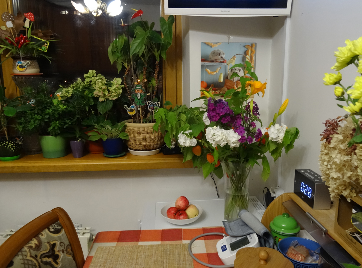 Вот так встал морозильник между столом и подоконником. Видите беленький "столик", на котором стоит букет? Это он. Я пересмотрела много моделей. Мне было нужно найти морозильник, который войдет ПОД подоконник, а там высота 82 см. Увы, высота всех моделей морозильников начинается от 85 см. Ничего не подходило и вдруг я наткнулась на модель 63 см. Ура)). Вовремя пристроила баллы в МВидео (накопилось за год), а у них с 5 сентября обновляется система учета баллов. Так что я как раз их и пристроила. Удачная покупка)).